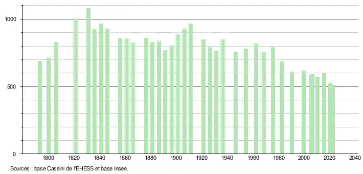 L'évolution du nombre d'habitants est connue à travers les recensements de la population effectués dans la commune depuis 1793. Pour les communes de moins de 10 000 habitants, une enquête de recensement portant sur toute la population est réalisée tous les cinq ans, les populations de référence des années intermédiaires étant quant à elles estimées par interpolation ou extrapolation[24]. Pour la commune, le premier recensement exhaustif entrant dans le cadre du nouveau dispositif a été réalisé en 2005[25].