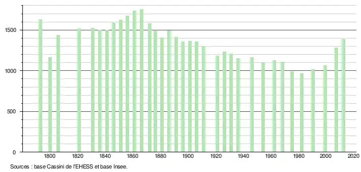 L'évolution du nombre d'habitants est connue à travers les recensements de la population effectués dans la commune depuis 1793. À partir du , les populations légales des communes sont publiées annuellement dans le cadre d'un recensement qui repose désormais sur une collecte d'information annuelle, concernant successivement tous les territoires communaux au cours d'une période de cinq ans. Pour les communes de moins de 10 000 habitants, une enquête de recensement portant sur toute la population est réalisée tous les cinq ans, les populations légales des années intermédiaires étant quant à elles estimées par interpolation ou extrapolation[11]. Pour la commune, le premier recensement exhaustif entrant dans le cadre du nouveau dispositif a été réalisé en 2007[12],[Note 1].