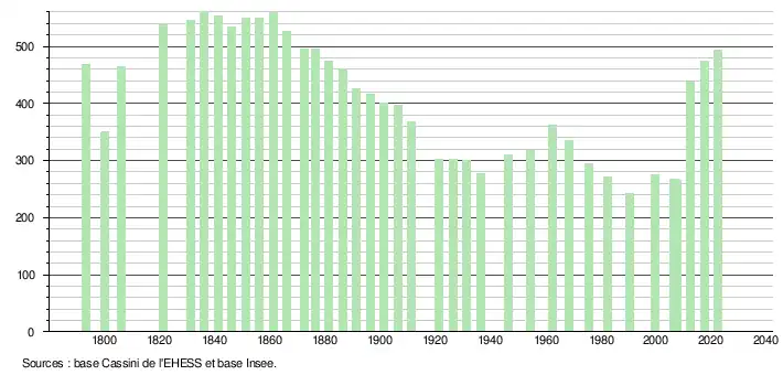 L'évolution du nombre d'habitants est connue à travers les recensements de la population effectués dans la commune depuis 1793. Pour les communes de moins de 10 000 habitants, une enquête de recensement portant sur toute la population est réalisée tous les cinq ans, les populations de référence des années intermédiaires étant quant à elles estimées par interpolation ou extrapolation[20]. Pour la commune, le premier recensement exhaustif entrant dans le cadre du nouveau dispositif a été réalisé en 2007[21].