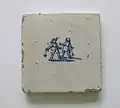 La plinthe est composée de carreaux de faïence de Delft, blancs avec des motifs bleus humanisés. On a reconnu, entre la laitière et la chaufferette, un Cupidon tenant son arc à bout de bras. De l'autre côté de la chaufferette se trouve, vraisemblablement, un vagabond, avec sa hotte sur le dos et s'appuyant sur un bâton. Le motif du carreau le plus à droite n'est pas identifiable[12].