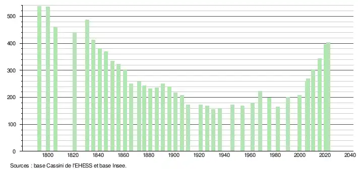 L'évolution du nombre d'habitants est connue à travers les recensements de la population effectués dans la commune depuis 1793. Pour les communes de moins de 10 000 habitants, une enquête de recensement portant sur toute la population est réalisée tous les cinq ans, les populations de référence des années intermédiaires étant quant à elles estimées par interpolation ou extrapolation[28]. Pour la commune, le premier recensement exhaustif entrant dans le cadre du nouveau dispositif a été réalisé en 2005[29].