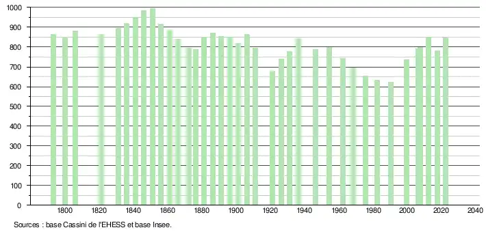 L'évolution du nombre d'habitants est connue à travers les recensements de la population effectués dans la commune depuis 1793. Pour les communes de moins de 10 000 habitants, une enquête de recensement portant sur toute la population est réalisée tous les cinq ans, les populations de référence des années intermédiaires étant quant à elles estimées par interpolation ou extrapolation[39]. Pour la commune, le premier recensement exhaustif entrant dans le cadre du nouveau dispositif a été réalisé en 2007[40].