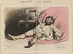 Républicaine et anticléricale[2], la Lune rousse est plusieurs fois confrontée à la censure. Moins de quinze jours après la parution du premier numéro, un dessin évoquant le scandale Germiny est ainsi interdit[3]. Le numéro du 25 février 1877, vendu au profit des canuts de la Croix-Rousse, est saisi car son dessin n'a pas été soumis à l'autorisation préalable[4]. La semaine suivante, Gill proteste au moyen d'un dessin dans lequel il fait face à la censure, symbolisée par une monstrueuse paire de ciseaux, tandis que la Lune rousse, effrayée, vient chercher refuge auprès du dessinateur.