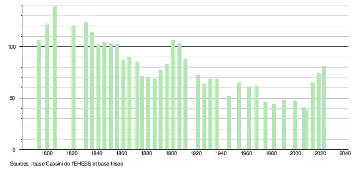 L'évolution du nombre d'habitants est connue à travers les recensements de la population effectués dans la commune depuis 1793. Pour les communes de moins de 10 000 habitants, une enquête de recensement portant sur toute la population est réalisée tous les cinq ans, les populations de référence des années intermédiaires étant quant à elles estimées par interpolation ou extrapolation[28]. Pour la commune, le premier recensement exhaustif entrant dans le cadre du nouveau dispositif a été réalisé en 2008[29].