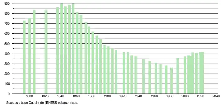 L'évolution du nombre d'habitants est connue à travers les recensements de la population effectués dans la commune depuis 1793. Pour les communes de moins de 10 000 habitants, une enquête de recensement portant sur toute la population est réalisée tous les cinq ans, les populations de référence des années intermédiaires étant quant à elles estimées par interpolation ou extrapolation[26]. Pour la commune, le premier recensement exhaustif entrant dans le cadre du nouveau dispositif a été réalisé en 2004[27].