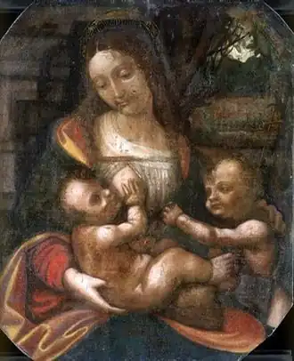 Le motif de la Vierge du lait se trouve dans des esquisses de la main de Léonard de Vinci[5], notamment sur un dessin conservé dans les collections royales du château de Windsor. Ce thème, très courant avant et pendant la Renaissance, n'est donc pas le propre de Léonard et de ses disciples. Autre constat, quand on examine la liste de représentations de la Vierge allaitant, on remarque simplement que la représentation à trois personnages est plus rare.