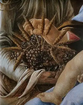 Adossée au mur d'angle du portique délimitant l'hortus conclusus, Marie est représentée assise, de trois-quarts et tient l'Enfant Jésus sur ses genoux. Un ange adolescent, au visage inspiré des modèles de Verrocchio et éclairé d'un sourire, et dont la tête est ceinte d'un feuillage de myrte, vient de faire irruption par l'ouverture du mur et tend à Marie une corbeille remplie de grappes de raisin et décorée de douze épis de blé. Prudemment, la Vierge se saisit d'un épi, tandis que l'Enfant, dont la grâce enfantine des précédentes œuvres de Botticelli a disparu, lève la main droite en signe de bénédiction, avec tout le sérieux d'une personne consciente de son futur destin.