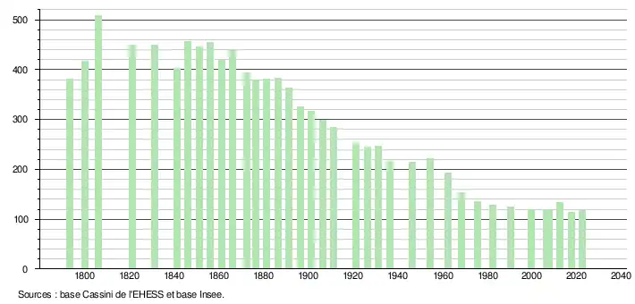 L'évolution du nombre d'habitants est connue à travers les recensements de la population effectués dans la commune depuis 1793. Pour les communes de moins de 10 000 habitants, une enquête de recensement portant sur toute la population est réalisée tous les cinq ans, les populations de référence des années intermédiaires étant quant à elles estimées par interpolation ou extrapolation[23]. Pour la commune, le premier recensement exhaustif entrant dans le cadre du nouveau dispositif a été réalisé en 2007[24].