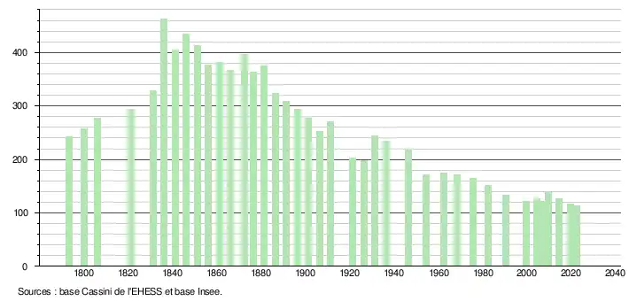 L'évolution du nombre d'habitants est connue à travers les recensements de la population effectués dans la commune depuis 1793. Pour les communes de moins de 10 000 habitants, une enquête de recensement portant sur toute la population est réalisée tous les cinq ans, les populations de référence des années intermédiaires étant quant à elles estimées par interpolation ou extrapolation[14]. Pour la commune, le premier recensement exhaustif entrant dans le cadre du nouveau dispositif a été réalisé en 2004[15].