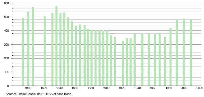- ↑ Dans le tableau des recensements et le graphique, par convention dans Wikipédia, le principe a été retenu, pour les populations légales postérieures à 1999 de n’afficher dans le tableau des recensements et le graphique que les populations correspondant à l'année 2006, première population légale publiée calculée conformément aux concepts définis dans le décret no 2003-485 du 5 juin 2003, et les années correspondant à une enquête exhaustive de recensement pour les communes de moins de 10 000 habitants, ainsi que la dernière population légale publiée par l’Insee.