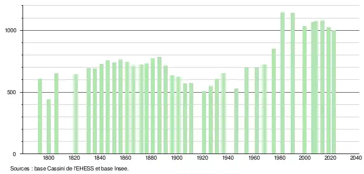 L'évolution du nombre d'habitants est connue à travers les recensements de la population effectués dans la commune depuis 1793. Pour les communes de moins de 10 000 habitants, une enquête de recensement portant sur toute la population est réalisée tous les cinq ans, les populations de référence des années intermédiaires étant quant à elles estimées par interpolation ou extrapolation[35]. Pour la commune, le premier recensement exhaustif entrant dans le cadre du nouveau dispositif a été réalisé en 2008[36].