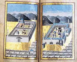Après avoir pris la cité, Mahomet la consacre ville sainte. Les idoles païennes de la Kaaba sont détruites en janvier 630 (sauf la Pierre noire et une icône de la Vierge à l'Enfant, selon une tradition rapportée par Al-Azraqi (en)[82]). La Ka'ba à la Mecque sera interdite aux seuls païens l'année suivante, décision accompagnée de la sourate 9, verset 28[83]. L'interdiction à tous les non-musulmans de la Mecque et de Medine sera postérieure aux quatre premiers califes. Muhammad Hamidullah la date de « basse époque, peut-être de celle des Ottomans », rappelant au passage que le deuxième calife Omar recevait les plaintes des dhimmis au sein même de la mosquée de la Kaaba et qu'un peu plus tard un médecin chrétien disposait d'un cabinet au pied du minaret de cette dernière[84]. À la suite d'une nouvelle révélation alléguée par le Prophète, le pèlerinage à la Ka'ba devient l'un des cinq piliers de l'islam pour les musulmans sunnites et l'une des dix pratiques de la foi (ou Furû' ad-Dîn) pour les chiites duodécimains.