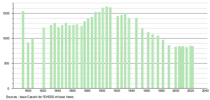 L'évolution du nombre d'habitants est connue à travers les recensements de la population effectués dans la commune depuis 1793. Pour les communes de moins de 10 000 habitants, une enquête de recensement portant sur toute la population est réalisée tous les cinq ans, les populations de référence des années intermédiaires étant quant à elles estimées par interpolation ou extrapolation[22]. Pour la commune, le premier recensement exhaustif entrant dans le cadre du nouveau dispositif a été réalisé en 2004[23].