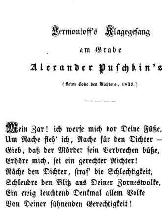 - ↑ Selon Lermontov : « j'ai écrit mes vers pour la mort de Pouchkine (Déclaration du cornette du régiment des hussards de la Garde Lermontov) »