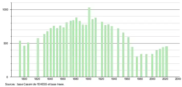 L'évolution du nombre d'habitants est connue à travers les recensements de la population effectués dans la commune depuis 1793. Pour les communes de moins de 10 000 habitants, une enquête de recensement portant sur toute la population est réalisée tous les cinq ans, les populations de référence des années intermédiaires étant quant à elles estimées par interpolation ou extrapolation[16]. Pour la commune, le premier recensement exhaustif entrant dans le cadre du nouveau dispositif a été réalisé en 2006[17].