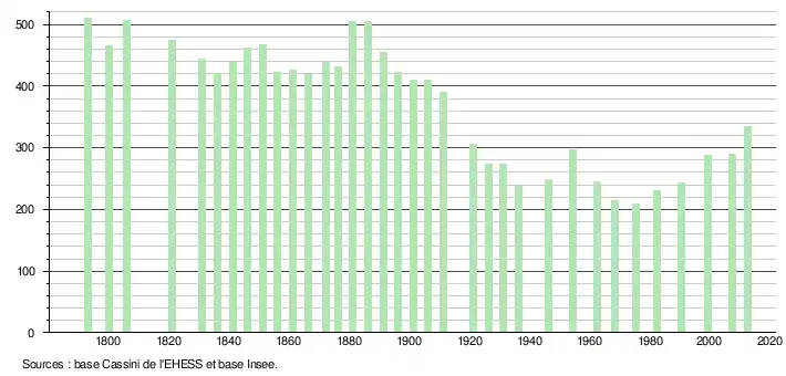 L'évolution du nombre d'habitants est connue à travers les recensements de la population effectués dans la commune depuis 1793. À partir du , les populations légales des communes sont publiées annuellement dans le cadre d'un recensement qui repose désormais sur une collecte d'information annuelle, concernant successivement tous les territoires communaux au cours d'une période de cinq ans. Pour les communes de moins de 10 000 habitants, une enquête de recensement portant sur toute la population est réalisée tous les cinq ans, les populations légales des années intermédiaires étant quant à elles estimées par interpolation ou extrapolation[2]. Pour la commune, le premier recensement exhaustif entrant dans le cadre du nouveau dispositif a été réalisé en 2007[3],[Note 1].