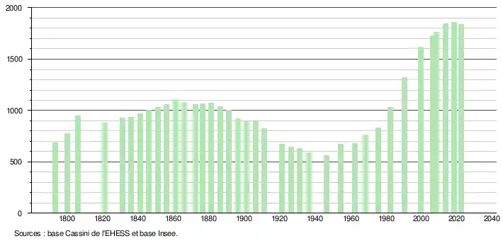 L'évolution du nombre d'habitants est connue à travers les recensements de la population effectués dans la commune depuis 1793. Pour les communes de moins de 10 000 habitants, une enquête de recensement portant sur toute la population est réalisée tous les cinq ans, les populations de référence des années intermédiaires étant quant à elles estimées par interpolation ou extrapolation[25]. Pour la commune, le premier recensement exhaustif entrant dans le cadre du nouveau dispositif a été réalisé en 2008[26].