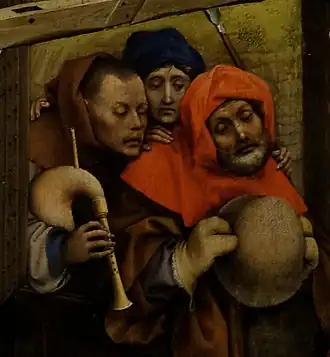 Le paysage de l'arrière-plan multiplie les recherches novatrices et constitue, selon l'ancienne conservatrice du musée Sophie Jugie, l'un des premiers paysages naturalistes de la peinture occidentale[3], après quelques expériences dans les années précédentes dans les manuscrits (notamment dans les miniatures des Heures du Maréchal de Boucicaut). Représenté à la place du fond d'or encore traditionnel à cette époque, il restitue aussi l'exacte description de la saison et de la lumière. Les couleurs s'atténuent au loin et la route qui serpente suggère la profondeur. Les personnages sont remarquables par le réalisme des visages et le rendu des matières. Le personnage placé de dos au premier plan attire l'attention sur la scène principale[3].