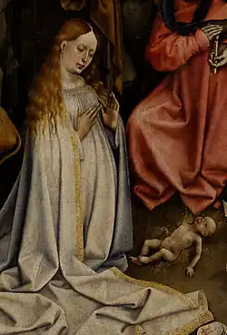 Sous un édifice de bois en ruine, la Vierge est à genoux avec les mains levées dans un geste connu sous le nom d’expansis manibus. Elle porte une tunique blanche avec un manteau de la même couleur orné de broderies d'or, ce qui rompt avec les représentations antérieures dans lesquelles Marie est vêtue de bleu céleste ; ses cheveux roux flottent sur ses épaules. Ces détails correspondent à la vision de Brigitte de Suède lorsqu'elle visita la grotte de la Nativité à Béthléem en 1372[3]. La présence sur le manteau de la Vierge de la prière du Salve Regina[N 1], dévotion chère à Philippe le Bon a pu être présentée comme un argument pour étayer l'hypothèse d'un don du duc à la chartreuse de Champmol[3].