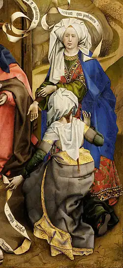À droite du tableau, les deux personnages en somptueux costumes sont les sages-femmes : Zelemi (Azel) - de dos - et Salomé - de face -. Elles sont identifiées par les phylactères qui portent leurs noms et leurs paroles[3],[N 3]. Les accoucheuses sont décrites dans les Évangiles apocryphes dans un passage au cours duquel Joseph, voyant que l'accouchement était imminent, part demander de l'aide et trouve Zelemi, lui explique la situation, et la convainc de l'accompagner ; Salomé les rejoint plus tard[21]. Ces femmes sont déjà représentées dans les peintures italiennes, baignant et habillant l'Enfant Jésus, des gestes différents de ceux peints par Campin.