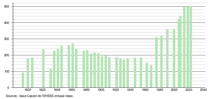 L'évolution du nombre d'habitants est connue à travers les recensements de la population effectués dans la commune depuis 1793. Pour les communes de moins de 10 000 habitants, une enquête de recensement portant sur toute la population est réalisée tous les cinq ans, les populations de référence des années intermédiaires étant quant à elles estimées par interpolation ou extrapolation[46]. Pour la commune, le premier recensement exhaustif entrant dans le cadre du nouveau dispositif a été réalisé en 2008[47].