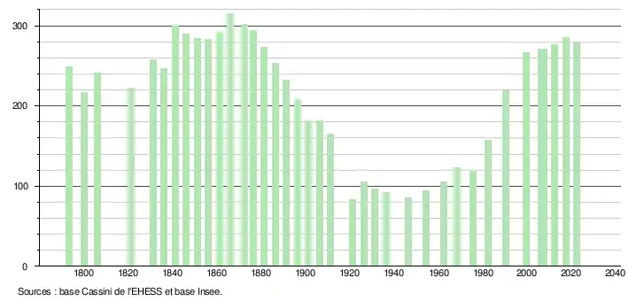 L'évolution du nombre d'habitants est connue à travers les recensements de la population effectués dans la commune depuis 1793. Pour les communes de moins de 10 000 habitants, une enquête de recensement portant sur toute la population est réalisée tous les cinq ans, les populations de référence des années intermédiaires étant quant à elles estimées par interpolation ou extrapolation[44]. Pour la commune, le premier recensement exhaustif entrant dans le cadre du nouveau dispositif a été réalisé en 2007[45].