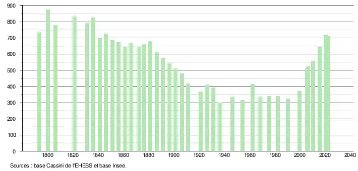 L'évolution du nombre d'habitants est connue à travers les recensements de la population effectués dans la commune depuis 1793. Pour les communes de moins de 10 000 habitants, une enquête de recensement portant sur toute la population est réalisée tous les cinq ans, les populations de référence des années intermédiaires étant quant à elles estimées par interpolation ou extrapolation[27]. Pour la commune, le premier recensement exhaustif entrant dans le cadre du nouveau dispositif a été réalisé en 2005[28].