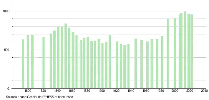 - ↑ Population municipale de référence en vigueur au 1er janvier 2025, millésimée 2022, définie dans les limites territoriales en vigueur au 1er janvier 2024, date de référence statistique : 1er janvier 2022.