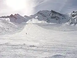Vue de la Norma depuis la Maurienne à l'ouest avec ses pentes couvertes par les remontées mécaniques et pistes de ski de la station de la Norma. | |||