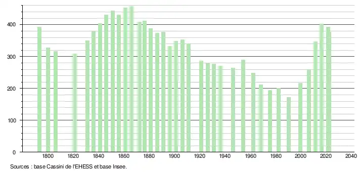 L'évolution du nombre d'habitants est connue à travers les recensements de la population effectués dans la commune depuis 1793. Pour les communes de moins de 10 000 habitants, une enquête de recensement portant sur toute la population est réalisée tous les cinq ans, les populations de référence des années intermédiaires étant quant à elles estimées par interpolation ou extrapolation[20]. Pour la commune, le premier recensement exhaustif entrant dans le cadre du nouveau dispositif a été réalisé en 2006[21].