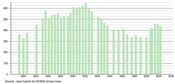 L'évolution du nombre d'habitants est connue à travers les recensements de la population effectués dans la commune depuis 1793. Pour les communes de moins de 10 000 habitants, une enquête de recensement portant sur toute la population est réalisée tous les cinq ans, les populations de référence des années intermédiaires étant quant à elles estimées par interpolation ou extrapolation[28]. Pour la commune, le premier recensement exhaustif entrant dans le cadre du nouveau dispositif a été réalisé en 2008[29].