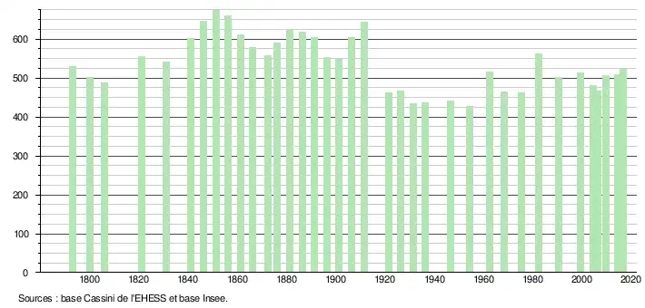L'évolution du nombre d'habitants est connue à travers les recensements de la population effectués dans la commune depuis 1793. Pour les communes de moins de 10 000 habitants, une enquête de recensement portant sur toute la population est réalisée tous les cinq ans, les populations de référence des années intermédiaires étant quant à elles estimées par interpolation ou extrapolation[19]. Pour la commune, le premier recensement exhaustif entrant dans le cadre du nouveau dispositif a été réalisé en 2004[20].