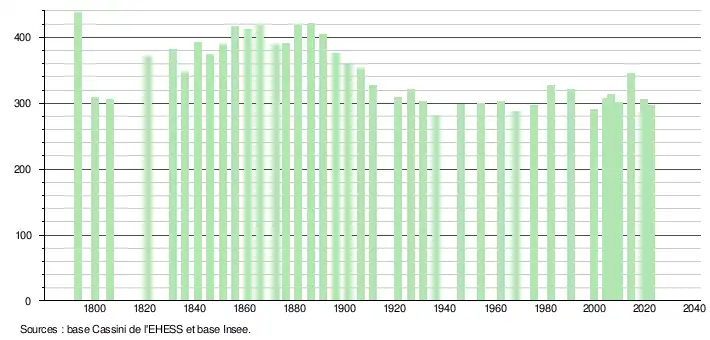 L'évolution du nombre d'habitants est connue à travers les recensements de la population effectués dans la commune depuis 1793. Pour les communes de moins de 10 000 habitants, une enquête de recensement portant sur toute la population est réalisée tous les cinq ans, les populations de référence des années intermédiaires étant quant à elles estimées par interpolation ou extrapolation[14]. Pour la commune, le premier recensement exhaustif entrant dans le cadre du nouveau dispositif a été réalisé en 2004[15].