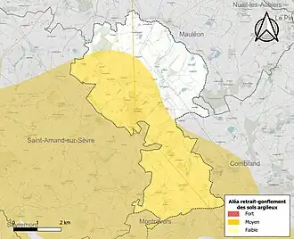 Les mouvements de terrains susceptibles de se produire sur la commune sont des tassements différentiels[16]. Le retrait-gonflement des sols argileux est susceptible d'engendrer des dommages importants aux bâtiments en cas d’alternance de périodes de sécheresse et de pluie[17]. 64,7 % de la superficie communale est en aléa moyen ou fort (54,9 % au niveau départemental et 48,5 % au niveau national)[Carte 2]. Depuis le , en application de la loi ELAN, différentes contraintes s'imposent aux vendeurs, maîtres d'ouvrages ou constructeurs de biens situés dans une zone classée en aléa moyen ou fort[Note 1],[18].