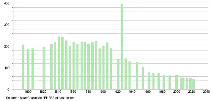 L'évolution du nombre d'habitants est connue à travers les recensements de la population effectués dans la commune depuis 1793. Pour les communes de moins de 10 000 habitants, une enquête de recensement portant sur toute la population est réalisée tous les cinq ans, les populations de référence des années intermédiaires étant quant à elles estimées par interpolation ou extrapolation[17]. Pour la commune, le premier recensement exhaustif entrant dans le cadre du nouveau dispositif a été réalisé en 2008[18].