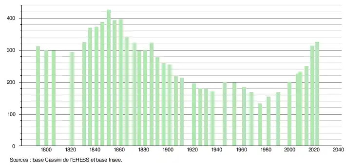 L'évolution du nombre d'habitants est connue à travers les recensements de la population effectués dans la commune depuis 1793. Pour les communes de moins de 10 000 habitants, une enquête de recensement portant sur toute la population est réalisée tous les cinq ans, les populations de référence des années intermédiaires étant quant à elles estimées par interpolation ou extrapolation[18]. Pour la commune, le premier recensement exhaustif entrant dans le cadre du nouveau dispositif a été réalisé en 2008[19].