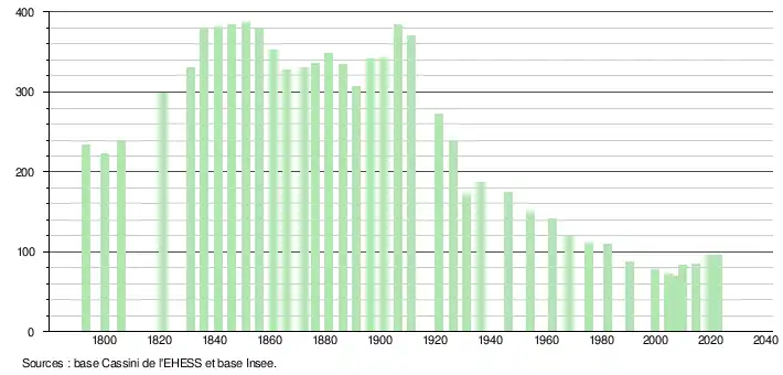 L'évolution du nombre d'habitants est connue à travers les recensements de la population effectués dans la commune depuis 1793. Pour les communes de moins de 10 000 habitants, une enquête de recensement portant sur toute la population est réalisée tous les cinq ans, les populations de référence des années intermédiaires étant quant à elles estimées par interpolation ou extrapolation[26]. Pour la commune, le premier recensement exhaustif entrant dans le cadre du nouveau dispositif a été réalisé en 2004[27].