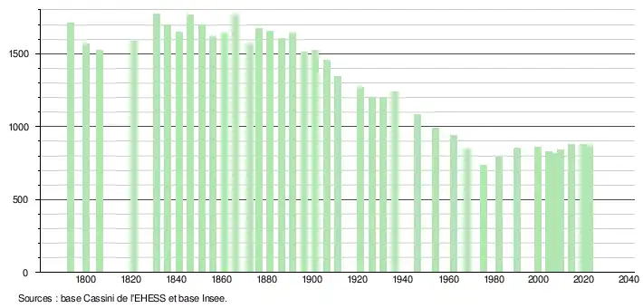 L'évolution du nombre d'habitants est connue à travers les recensements de la population effectués dans la commune depuis 1793. Pour les communes de moins de 10 000 habitants, une enquête de recensement portant sur toute la population est réalisée tous les cinq ans, les populations de référence des années intermédiaires étant quant à elles estimées par interpolation ou extrapolation[22]. Pour la commune, le premier recensement exhaustif entrant dans le cadre du nouveau dispositif a été réalisé en 2004[23].