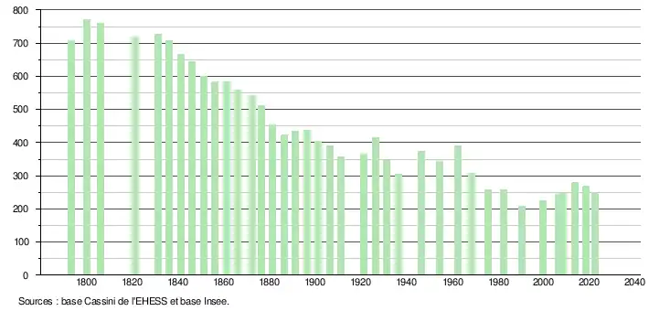 L'évolution du nombre d'habitants est connue à travers les recensements de la population effectués dans la commune depuis 1793. Pour les communes de moins de 10 000 habitants, une enquête de recensement portant sur toute la population est réalisée tous les cinq ans, les populations de référence des années intermédiaires étant quant à elles estimées par interpolation ou extrapolation[21]. Pour la commune, le premier recensement exhaustif entrant dans le cadre du nouveau dispositif a été réalisé en 2008[22].