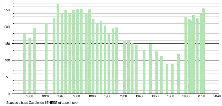 - ↑ Fiches Insee - Populations de référence de la commune pour les années 2006, 2007, 2008, 2009, 2010, 2011, 2012, 2013, 2014, 2015, 2016, 2017, 2018, 2019, 2020, 2021 et 2022.