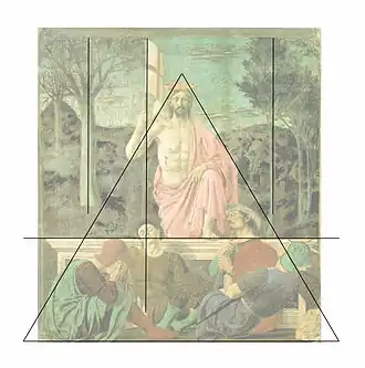 Le Christ en entouré d'arbres de part et d'autre d'un paysage de collines. Les deux troncs d'arbres et la hampe de la bannière forment une grille verticale ; la ligne passant par la hampe croise l'horizontale, du dessus du sarcophage, par la tête du soldat adossé de face.