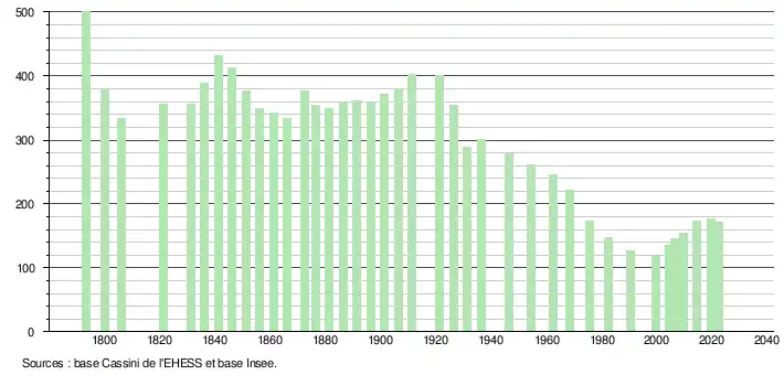 L'évolution du nombre d'habitants est connue à travers les recensements de la population effectués dans la commune depuis 1793. Pour les communes de moins de 10 000 habitants, une enquête de recensement portant sur toute la population est réalisée tous les cinq ans, les populations de référence des années intermédiaires étant quant à elles estimées par interpolation ou extrapolation[14]. Pour la commune, le premier recensement exhaustif entrant dans le cadre du nouveau dispositif a été réalisé en 2004[15].