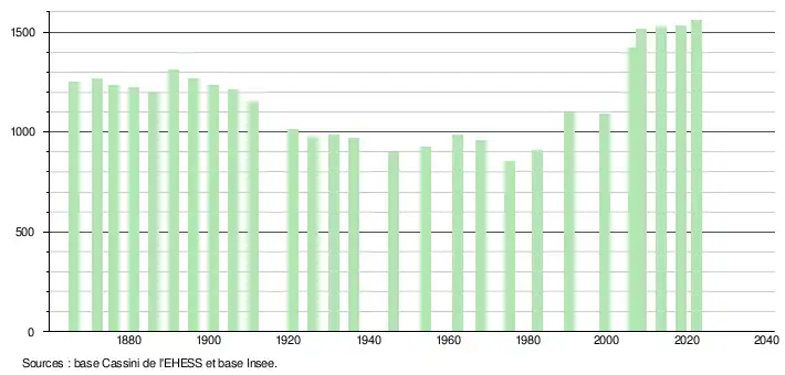 L'évolution du nombre d'habitants est connue à travers les recensements de la population effectués dans la commune depuis 1866. Pour les communes de moins de 10 000 habitants, une enquête de recensement portant sur toute la population est réalisée tous les cinq ans, les populations de référence des années intermédiaires étant quant à elles estimées par interpolation ou extrapolation[19]. Pour la commune, le premier recensement exhaustif entrant dans le cadre du nouveau dispositif a été réalisé en 2008[20].