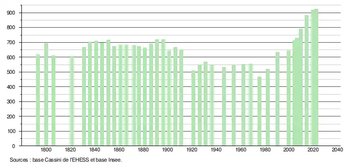 L'évolution du nombre d'habitants est connue à travers les recensements de la population effectués dans la commune depuis 1793. Pour les communes de moins de 10 000 habitants, une enquête de recensement portant sur toute la population est réalisée tous les cinq ans, les populations de référence des années intermédiaires étant quant à elles estimées par interpolation ou extrapolation[30]. Pour la commune, le premier recensement exhaustif entrant dans le cadre du nouveau dispositif a été réalisé en 2004[31].