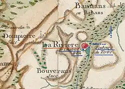 La Rivière est incendiée au XVe siècle. Charles le Téméraire y séjourne à plusieurs reprises lors des guerres de Bourgogne[Note 3]. Après le passage de Weimar pendant la guerre de Dix Ans, le bourg est en grande partie détruit. La Rivière avait des faubourgs nommés d'Arlin, du Tartre, et de Foule, une prison, la tour de la vieille prison, la tour ronde, un pont, un portail, plusieurs portes, des halles soutenues par des colonnes, un hôpital des Hospitaliers et un couvent de dominicains (mentionné comme tel au XIVe siècle) puis de jacobins, détruit au XVIIe siècle[16] ; l'église-mère, qui se trouvait primitivement à Dompierre, est déplacée à La Rivière et le prieur de Saint-Étienne de Pontarlier en est le patron ; elle était sous le vocable de Saint-Nicolas. Ses vicariales étaient Dompierre, Bonnevaux et Bouverans[15].