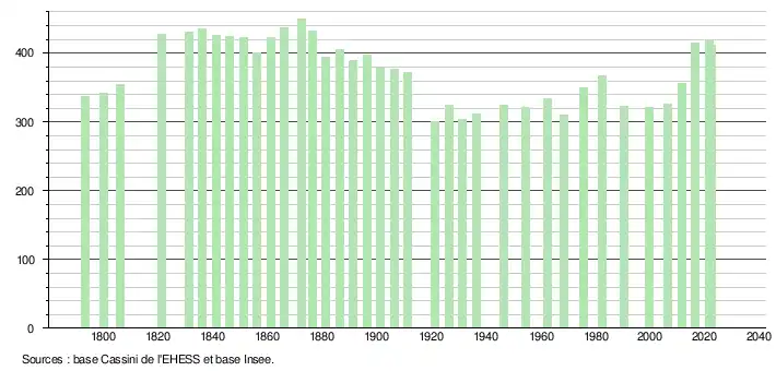 L'évolution du nombre d'habitants est connue à travers les recensements de la population effectués dans la commune depuis 1793. Pour les communes de moins de 10 000 habitants, une enquête de recensement portant sur toute la population est réalisée tous les cinq ans, les populations de référence des années intermédiaires étant quant à elles estimées par interpolation ou extrapolation[32]. Pour la commune, le premier recensement exhaustif entrant dans le cadre du nouveau dispositif a été réalisé en 2006[33].