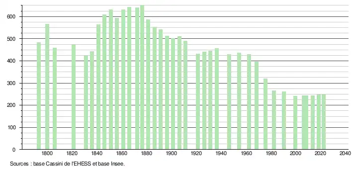 L'évolution du nombre d'habitants est connue à travers les recensements de la population effectués dans la commune depuis 1793. Pour les communes de moins de 10 000 habitants, une enquête de recensement portant sur toute la population est réalisée tous les cinq ans, les populations de référence des années intermédiaires étant quant à elles estimées par interpolation ou extrapolation[16]. Pour la commune, le premier recensement exhaustif entrant dans le cadre du nouveau dispositif a été réalisé en 2008[17].