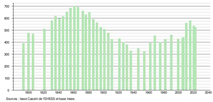 - ↑ Fiches Insee - Populations de référence de la commune pour les années 2006, 2007, 2008, 2009, 2010, 2011, 2012, 2013, 2014, 2015, 2016, 2017, 2018, 2019, 2020, 2021 et 2022.