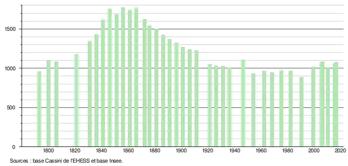 L'évolution du nombre d'habitants est connue à travers les recensements de la population effectués dans la commune depuis 1793. Pour les communes de moins de 10 000 habitants, une enquête de recensement portant sur toute la population est réalisée tous les cinq ans, les populations de référence des années intermédiaires étant quant à elles estimées par interpolation ou extrapolation[18]. Pour la commune, le premier recensement exhaustif entrant dans le cadre du nouveau dispositif a été réalisé en 2005[19].