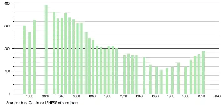 L'évolution du nombre d'habitants est connue à travers les recensements de la population effectués dans la commune depuis 1793. Pour les communes de moins de 10 000 habitants, une enquête de recensement portant sur toute la population est réalisée tous les cinq ans, les populations de référence des années intermédiaires étant quant à elles estimées par interpolation ou extrapolation[18]. Pour la commune, le premier recensement exhaustif entrant dans le cadre du nouveau dispositif a été réalisé en 2006[19].